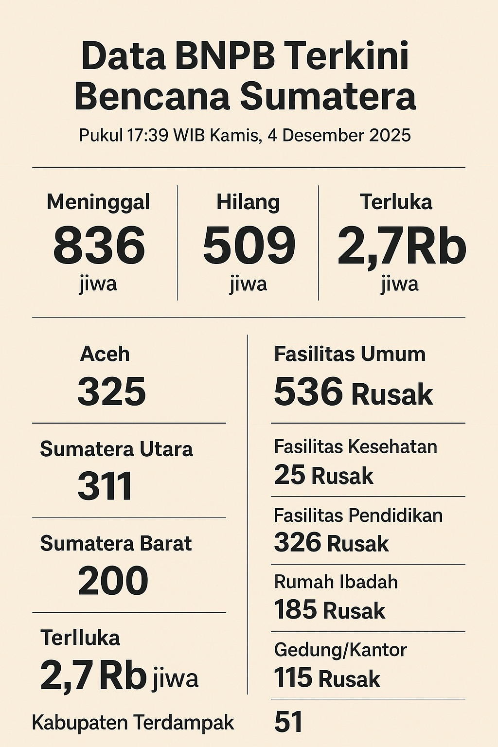 Sumber: BNPB – 4 Desember 2025, Pukul 17:39 WIB. Akan di update selanjutnya.