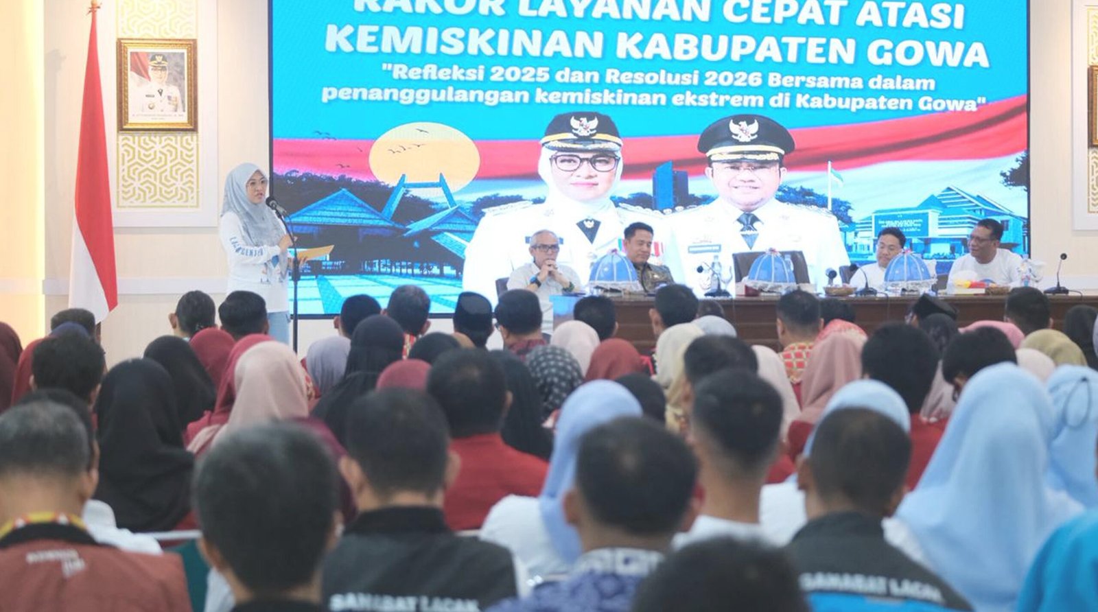 LACAK - Bupati Gowa Sitti Husniah Talenrang membuka Rapat Koordinasi Layanan Cepat Atasi Kemiskinan (LACAK) di Baruga Tinggimae, Rumah Jabatan Bupati Gowa, Kamis (15/1/2026). Pemkab Gowa memperkuat kolaborasi LACAK dan Baznas untuk menekan angka kemiskinan ekstrem. (foto/ist)
