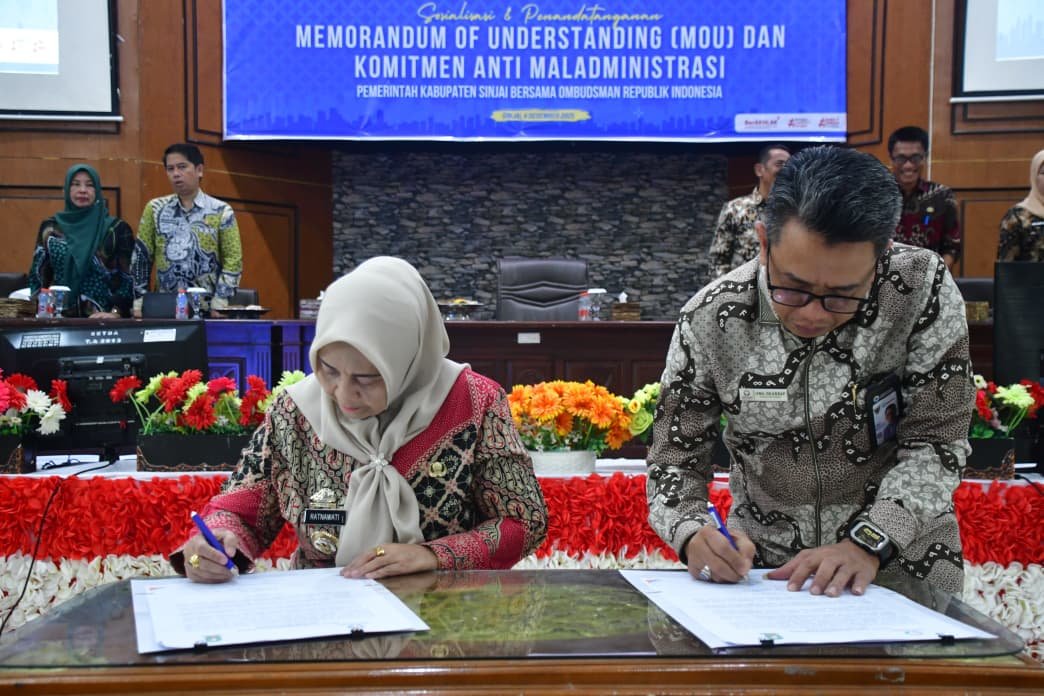 MoU - Bupati Sinjai, Hj. Ratnawati Arif, Menandatangai MoU Sinergi Peningkatan Kualitas Pelayanan Publik dengan Ombudsman RI Tahun 2025, di Ruang Pola Kantor Bupati Sinjai, Kamis (4/12/2025). (foto/ist)