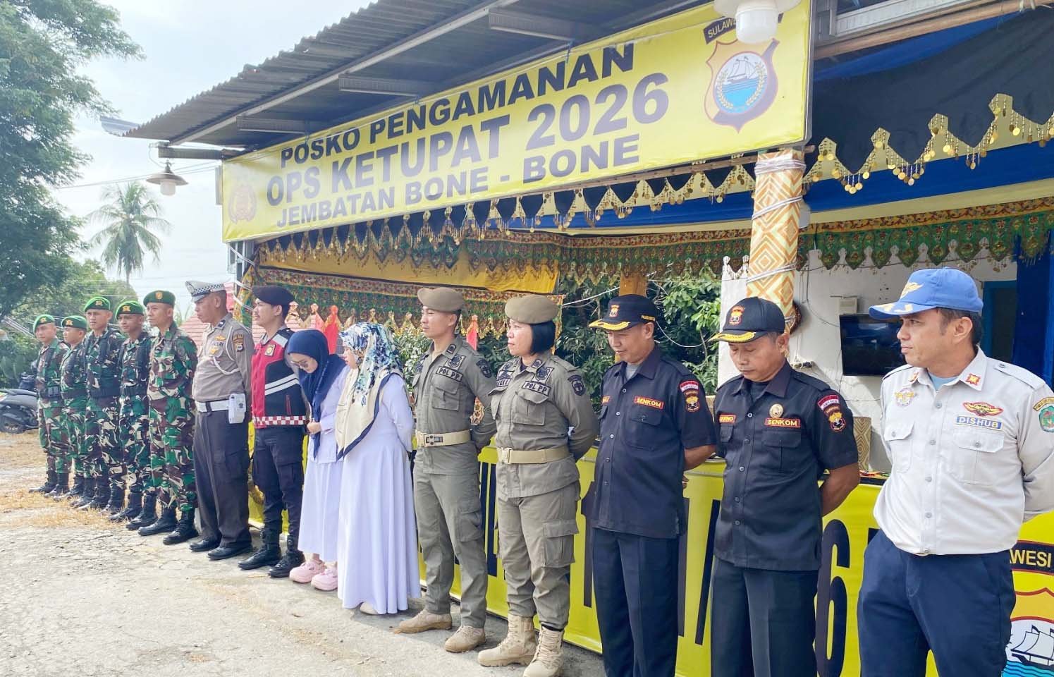 POSKO MUDIK LUWU UTARA — Personel gabungan TNI, Polri, tenaga kesehatan, dan instansi terkait bersiaga di Pos Pengamanan Tugu Durian Sabbang, Kabupaten Luwu Utara, saat pelaksanaan Operasi Ketupat Lebaran 1447 Hijriah. Posko ini disiapkan untuk memastikan keamanan dan pelayanan bagi pemudik. (foto/ist)