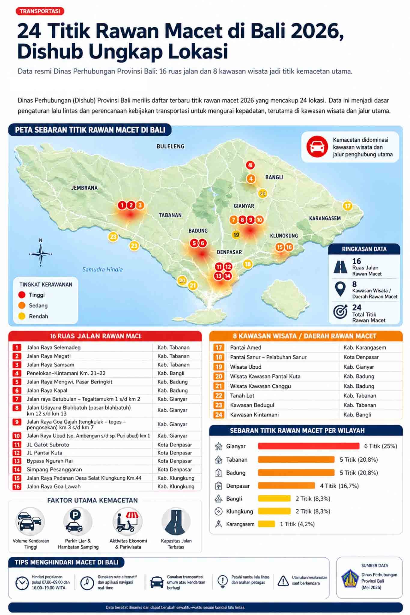 JAMLIMA.COM, DENPASAR — Dinas Perhubungan (Dishub) Provinsi Bali merilis daftar terbaru titik rawan macet Bali 2026 yang mencakup 24 lokasi, terdiri dari ruas jalan utama hingga kawasan wisata dengan volume kendaraan tinggi.